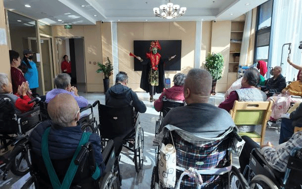 周六上午,陈滢老师带领志愿者们来到敬老院,首先安排志愿者把精心准备的慰问水果送给每位老人,并与他们促膝长谈,关切地询问他们的身体状况和日常生活。敬老院内因为志愿者的到来而一改往日的宁静,到处洋溢着青春的朝气与欢声笑语。慰问环节过后,志愿者们还为老人们呈现了一场别开生面的的文艺表演。活力群舞《桃花朵朵开》、中华瑰宝川剧变脸、韵味十足的即兴古典舞等,老人们被志愿者的表演深深吸引,不住的称赞、掌声。演出被全体志愿者与老人们温情的大合唱推向高潮,场面温馨感人。