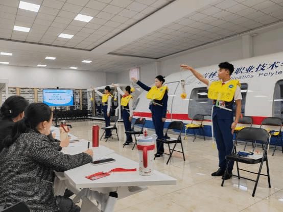 安全演示:在模拟客舱环境中,选手们化身为优雅专业的乘务员。他们以标准的姿态、清晰的指令和富有亲和力的微笑,完整、规范地进行救生衣、氧气面罩等安全设备的演示。每一个手势、每一个眼神都传递出专业与安心,体现了“安全是最高服务”的核心理念。
